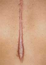 Келоидные рубцы отличаются от гипертрофированных тем, что они выходят за рамки первоначальной площади раны. Чаще всего развиваются у людей с черным цветом кожи.